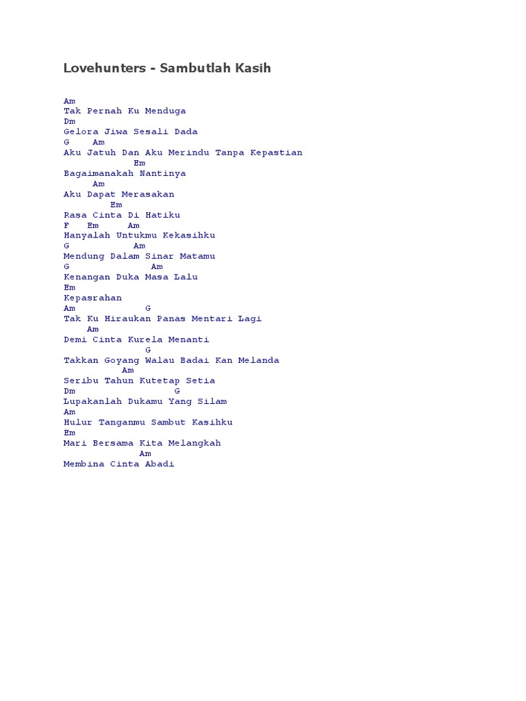 About Press Copyright Contact us Creators Advertise Developers Terms Privacy Policy Safety How YouTube works Test new features Press Copyright Contact us Creators. Lovehunters - Sambutlah Kasih Chord. Sambutlah Kasih Ku Tak pernah ku menduga Gelora jiwa sesali dada Aku jatuh dan aku merindu tanpa kepastian Bagaimanakah nantinya Aku dapat merasakan Rasa cinta di hatiku Hanyalah untukmu kekasihku 1 Mendung dalam sinar matamu Kenangan duka masa lalu Kepasrahan.